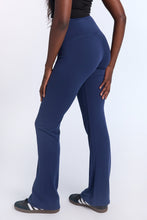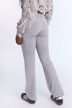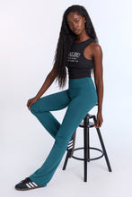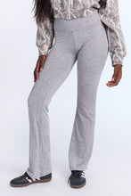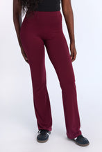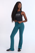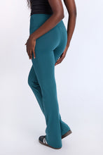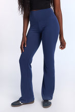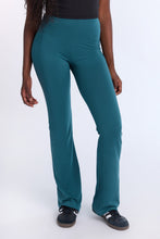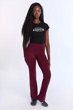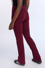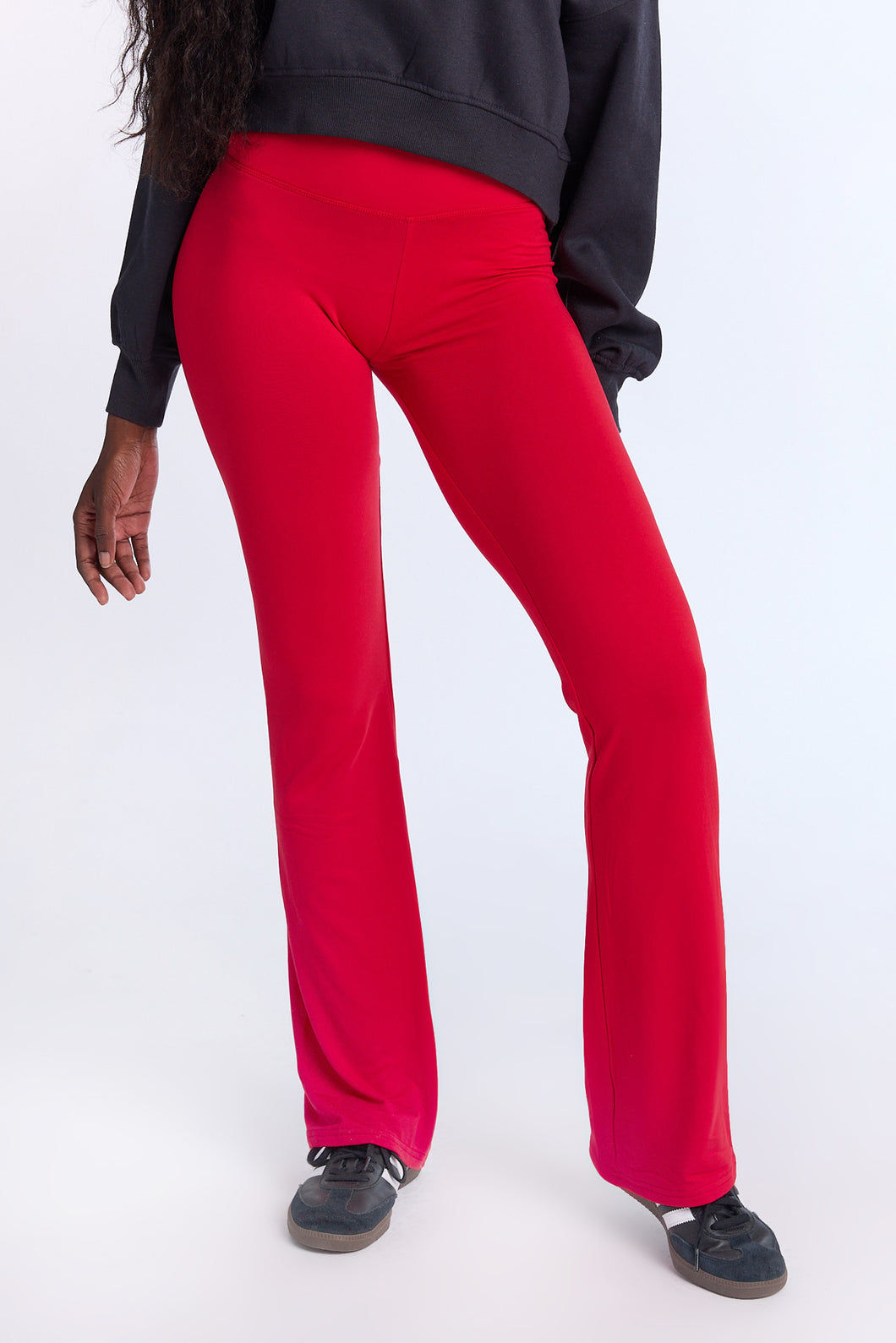 Tricot stretch. Mi-taille avec coupe près du corps et jambe évasée. Disponible en plusieurs couleurs. Ceinture élastique. Entrejambe d'environ 32 po.