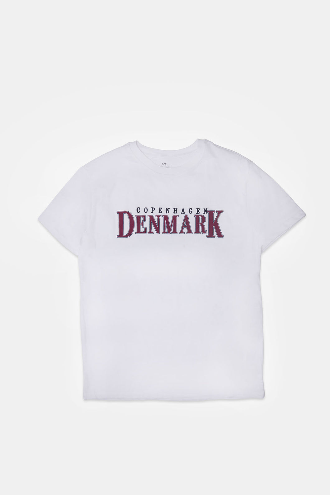 Jersey en tricot. Sérigraphie sur le devant. Motifs imprimés. Coupe garçonne. Manches courtes.
