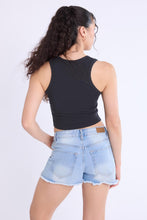 Denim. Rigid denim made from a 100% Cotton. High-waisted with multiple pockets. Shorty with a 2 1/2" inseam.