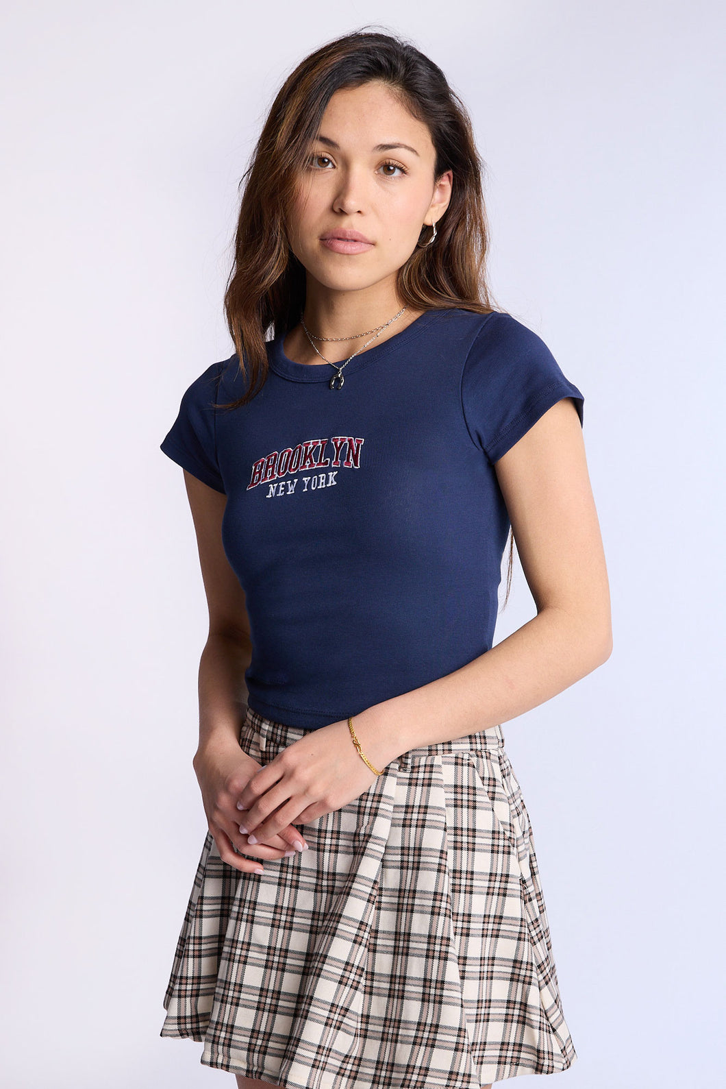 Knit jersey. Themed graphics. Short sleeves. Cropped and fitted Baby tee, cut close to the body for a silhouette that hugs your curves.