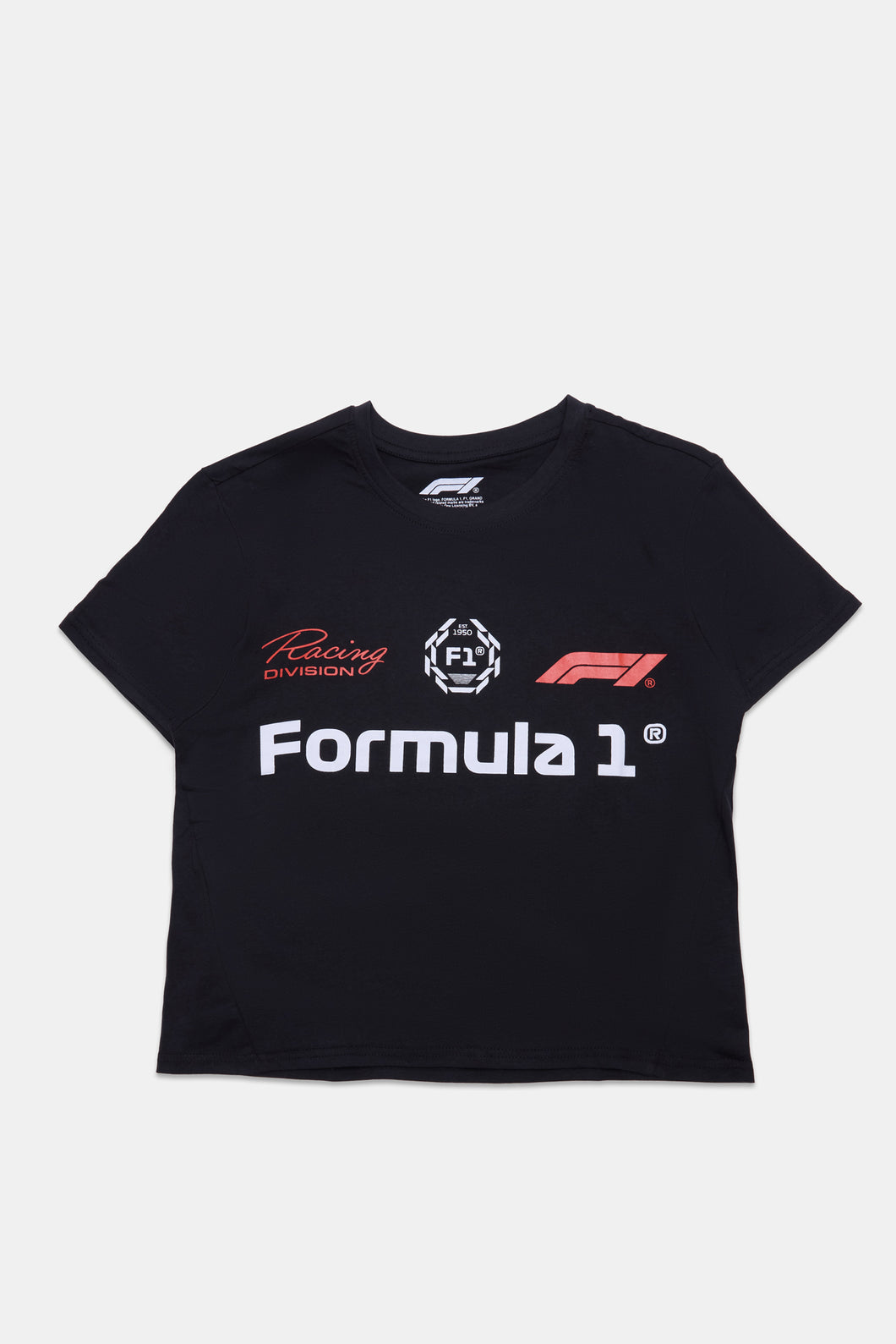 Knit jersey. Themed graphics. Short sleeves. Crew neck. Cropped and boxy fit.